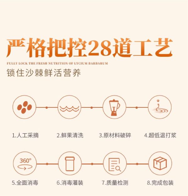 NFC生榨工艺的主要优势在于全程冷链处理,保留了沙棘果特有的生物活性成分。野山坡沙棘原浆采用每10粒沙棘果萃取一滴原浆的工艺标准,不添加水、糖及防腐剂,这种100%纯度的产品形态,极尽所能保留了天然沙棘果油和维生素群。